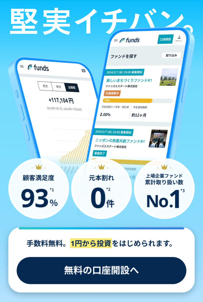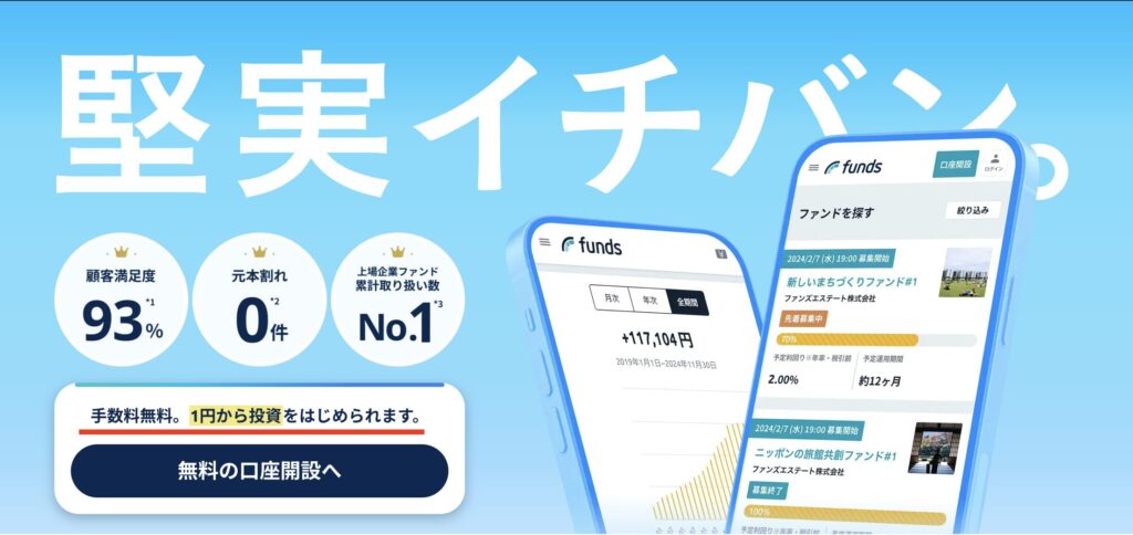 Fundsは上場企業を中心に、ローリスクで資産を増やせるクラファンだよ!