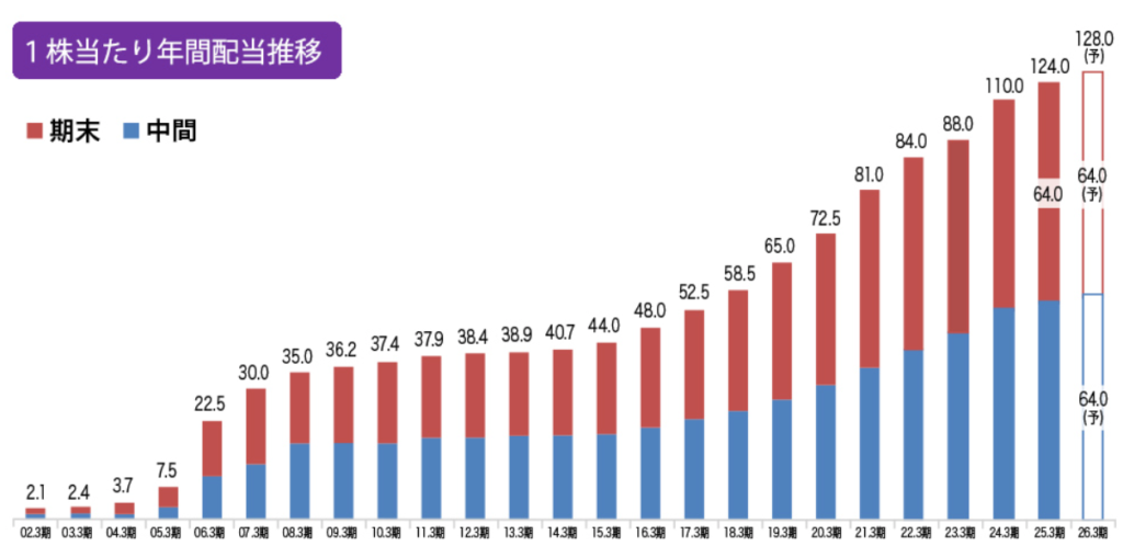 26年連続で配当金が増えていて(=増配)、会社としても今後も配当金を高めていく方針だよ!