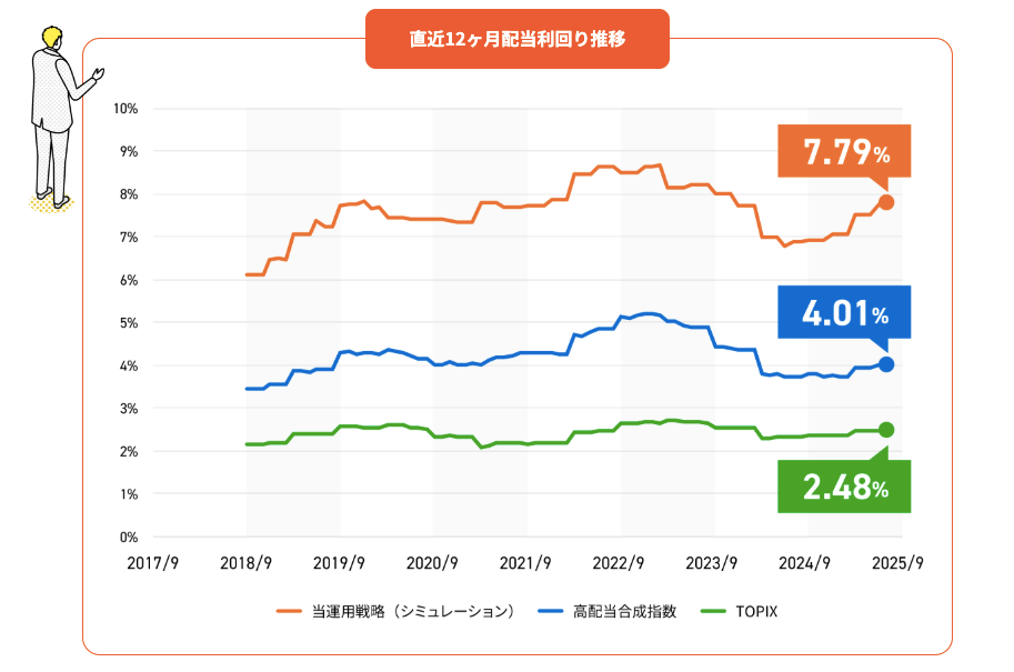特徴①で示した運用戦略を取ることで、直近では高い配当利回りが実現できてるよ!