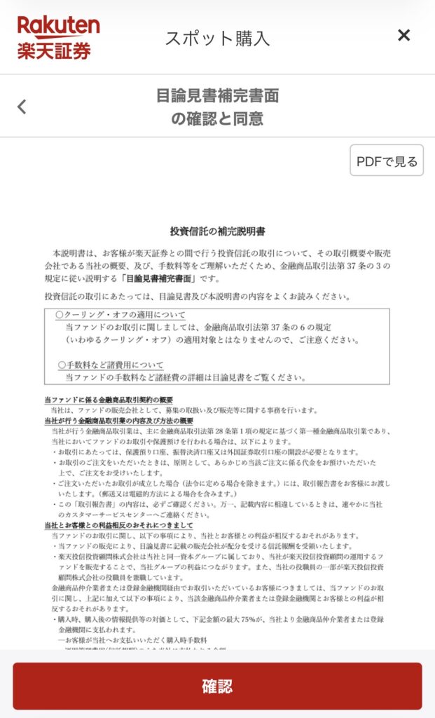 「購入」をタップして、目論見書(=商品説明書)を確認して「確認」をタップ。