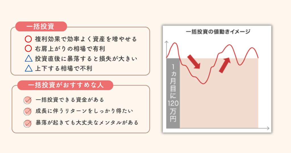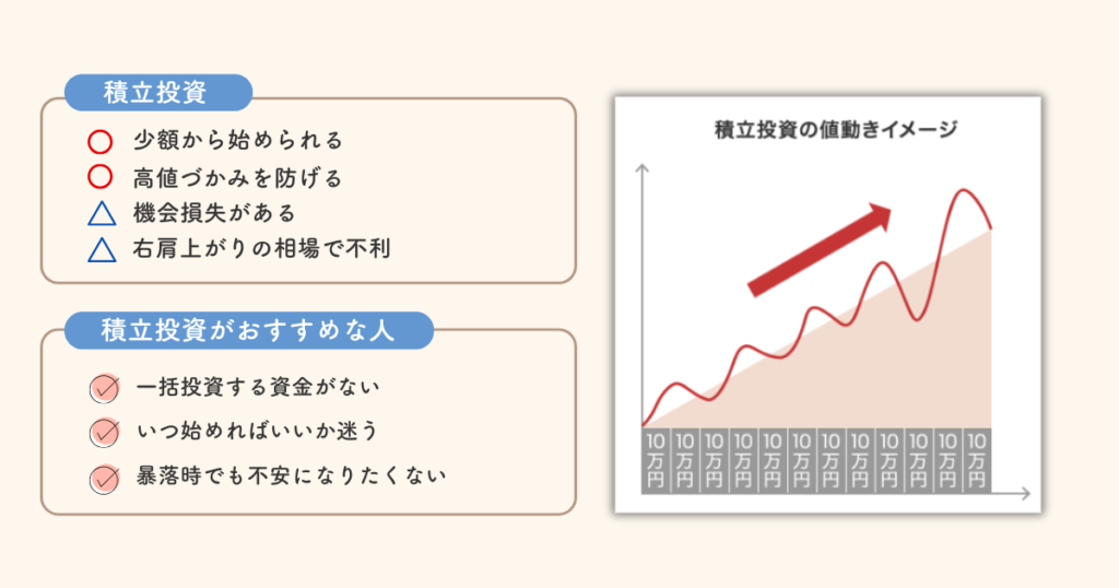 ただしまとまった資金を「一括投資」した後に、暴落が来て不安になって投資をやめてしまうくらいなら、コツコツ積立がベスト!