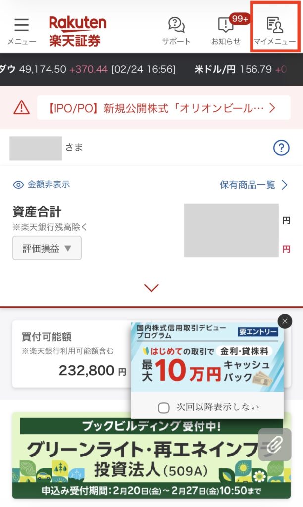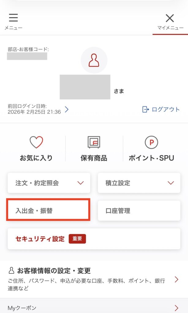 楽天証券にログインして、「マイメニュー」→「入出金・振替」をタップ。