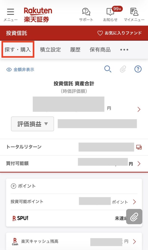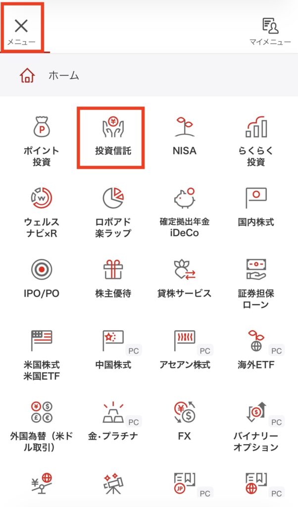 次は、実際に投資信託を買っていくよ!左上の「メニュー」→「投資信託」→「探す・購入」をタップ。