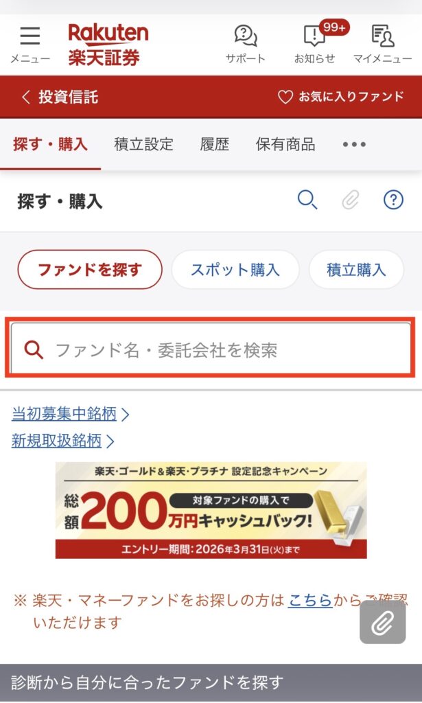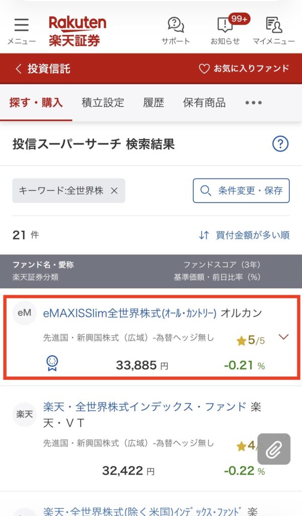 検索欄に購入したい投資信託を入力して、該当のファンドが出てきたらタップ。
