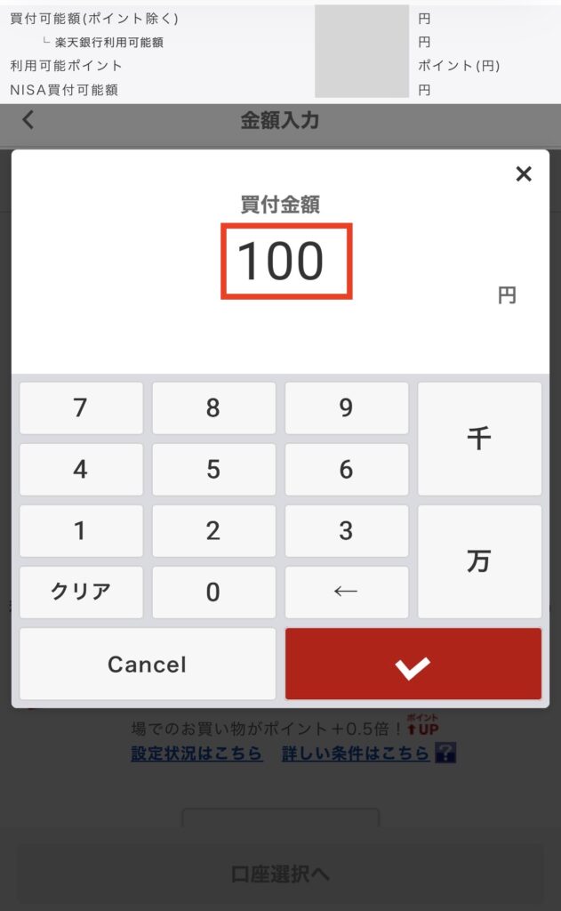 購入したい金額を入力するよ!楽天ポイントも使えるから、もし使いたい場合はここで入力して、「口座選択へ」をタップ。