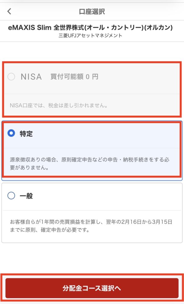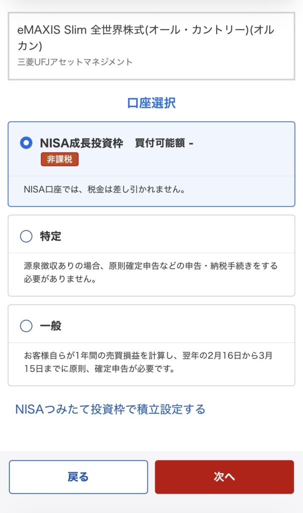 NISA(非課税)で投資したい場合は「NISA」、特定口座(課税)で投資したい場合は「特定」を選んでね!