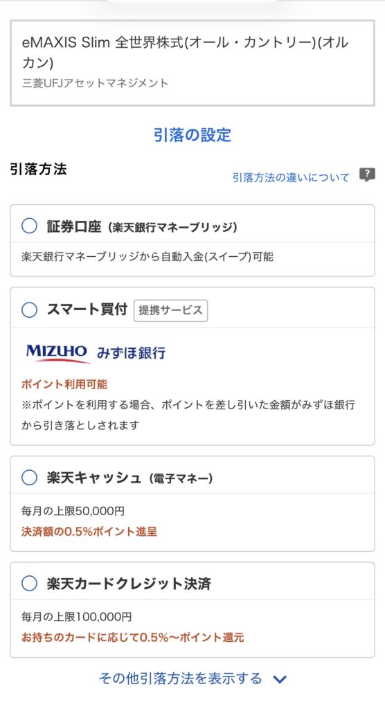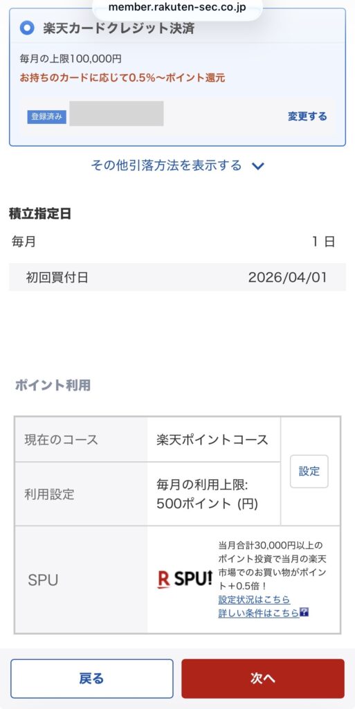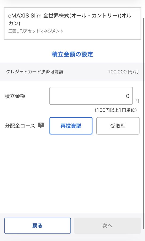 希望の引落方法を選択して、「次へ」をタップして、積立したい金額と分配金コースを選択。