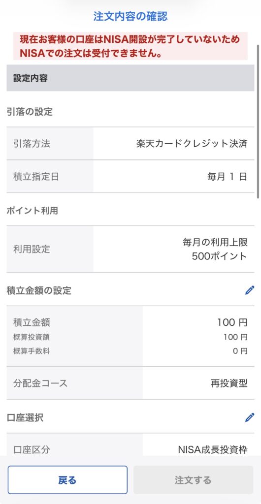 口座選択では、NISA(非課税)で投資したい場合は「NISA」、特定口座(課税)で投資したい場合は「特定」を選んでね!